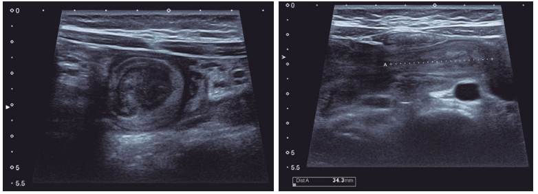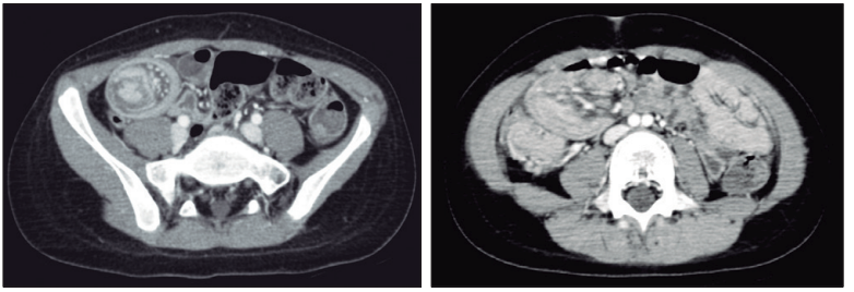 Varón de 5 años de edad, que presentó cuadro clínico de tres semanas de evolución, caracterizado por dolor abdominal de tipo cólico, a predominio periumbilical y en el flanco derecho, asociado a vómitos ocasionales durante el lapso de evolución. Consultó en el centro asistencial, donde se observó al momento de la valoración física, abdomen blando, doloroso a la palpación profunda, asociado a masa palpable en hemiabdomen derecho, sin signos francos de irritación peritoneal. Se le realizó una ecografía abdominal, que evidenció a nivel del hipocondrio y flanco derecho una imagen redondeada, con centro ecogénico, y dos anillos hipoecogénico e hiperecogénico periféricos (Figuras 1 y 2).