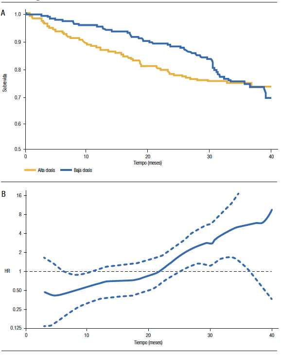 Figura 1. A) Curvas de sobrevida según tratamiento, B) Estimación del HR (y su IC 95%) durante el seguimiento.