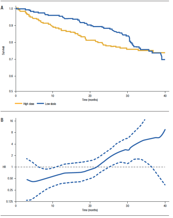 For practical purposes, we should suspect that the hazard proportionality assumption is not fulfilled when the survival curves show obvious changes in their slopes. Figure 1A shows the survival of two groups of patients with multiple myeloma treated with low and high doses of dexamethasone (ECOG Study): in the initial period, the survival curves are divergent, then they tend to be parallel and finally, converge (even intersecting). If we observe the HR graph throughout the follow-up (Figure 1B), we notice that the HR is not constant. Initially, it is less than 1 (indicating that the hazard of the low-dose group is lower), then towards the middle of follow-up it is equal to 1 and finally, it is greater than 1. The estimated HR in this study was 0.87, which should not be interpreted as a uniform 13% reduction in mortality for the low-dose group.5