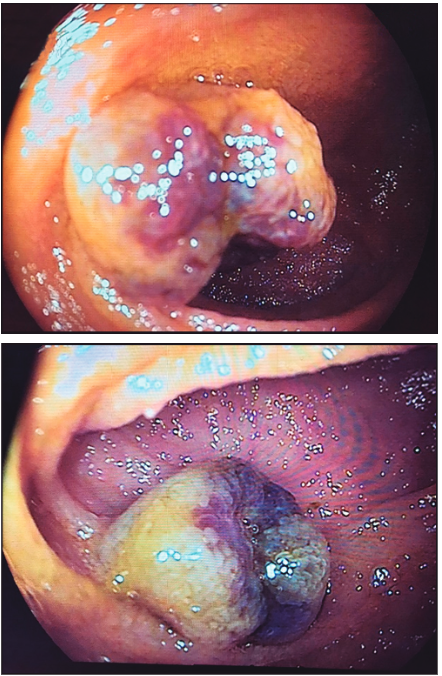 ileocecal, se evidenció lesión elevada lobulada, de color azulado, de 30 mm de diámetro, sin signos de