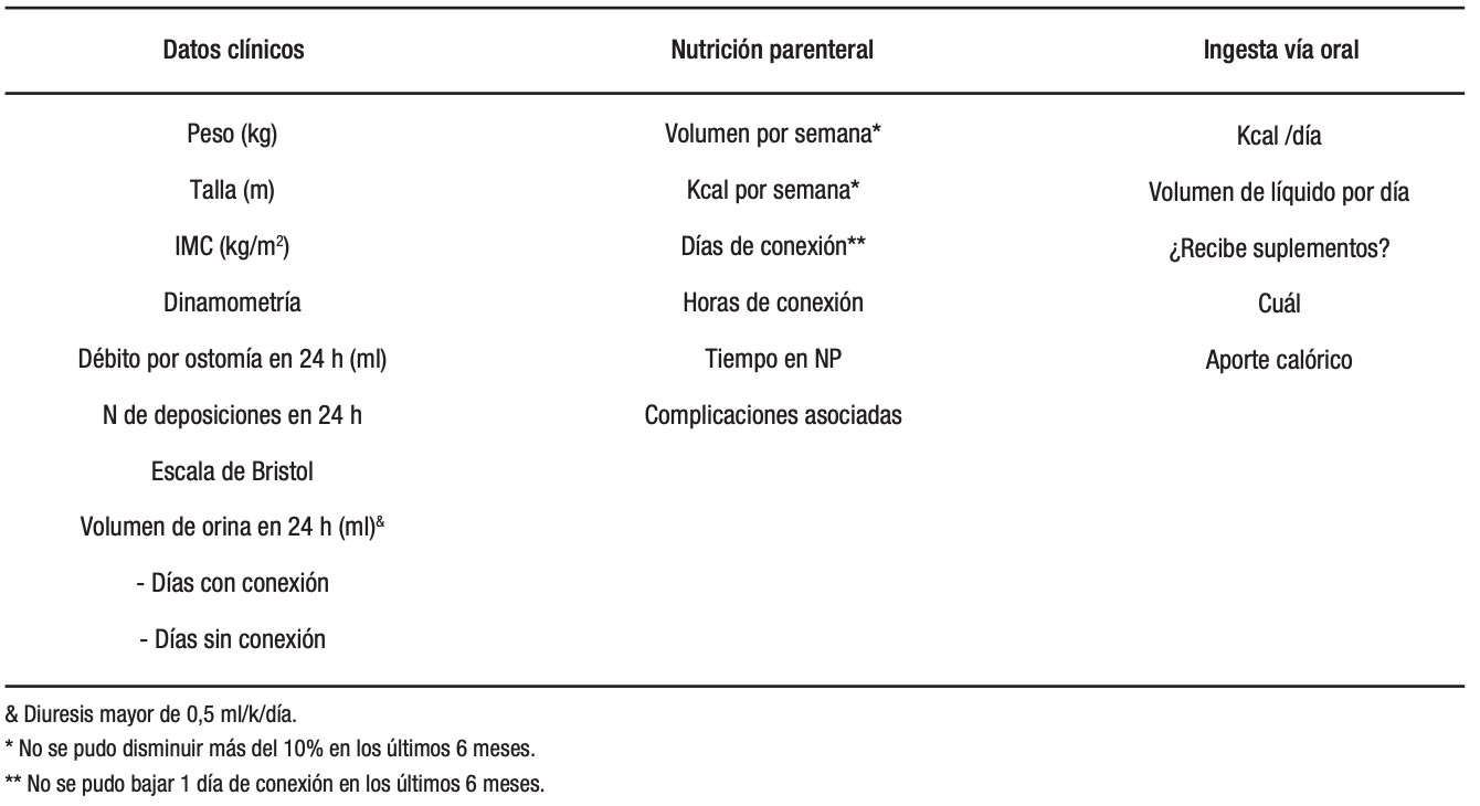 - Complicaciones asociadas a la NP (pérdida de los accesos venosos por trombosis, enfermedad hepática o sepsis recurrente) y que los haga candidatos a trasplante de intestino.