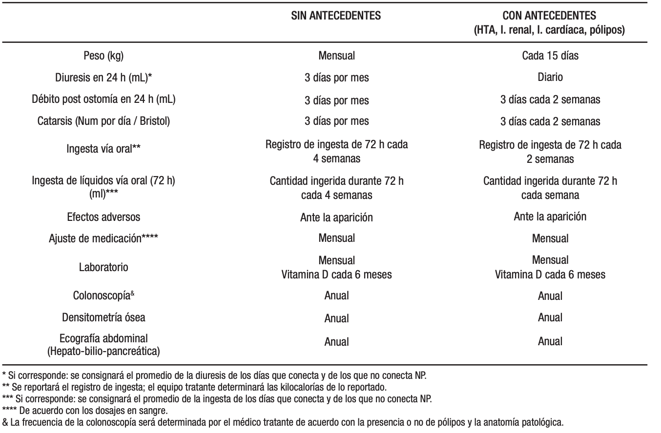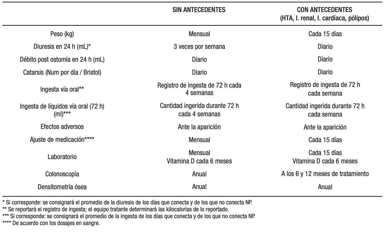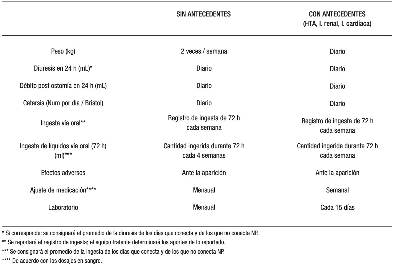 Esta valoración y cambios en la composición de la bolsa de NP se harán cada 3-4 semanas según el criterio médico.