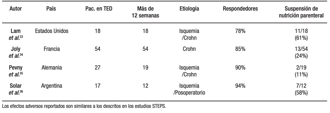 - STEPS-3 (NCT01560403):3212 meses más de extensión en pacientes que completaron el STEPS 2. En el 50% se bajó el volumen de la NP basal y se redujo en 2-3 días la frecuencia de conexiones, y en 2 de 13 pacientes se suspendió la NP.