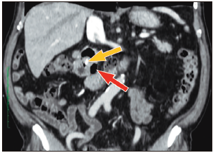 Figura 2. Tomografía abdominal (corte coronal): divertículo duodenal periampular
