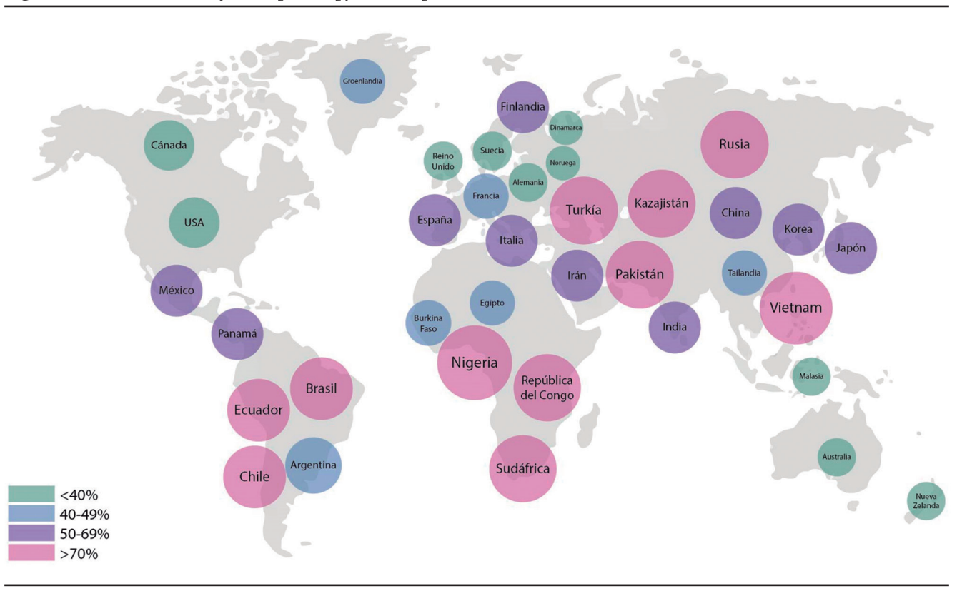 En la Figura 1, se presenta una estimación de la prevalencia de infección por H. pylori en distintas regiones del mundo.