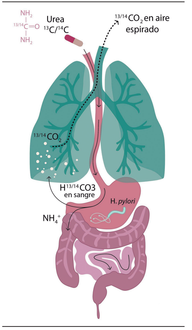 El mecanismo de acción de este método diagnóstico consiste en la hidrólisis de urea usando isótopos del carbono, y una vez que se administra por vía oral, la enzima ureasa de H. pylori produce, de manera importante, amoníaco y dióxido de carbono, el cual se difunde por la sangre hacia los pulmones, permitiendo así su medición35 (Figura 2).