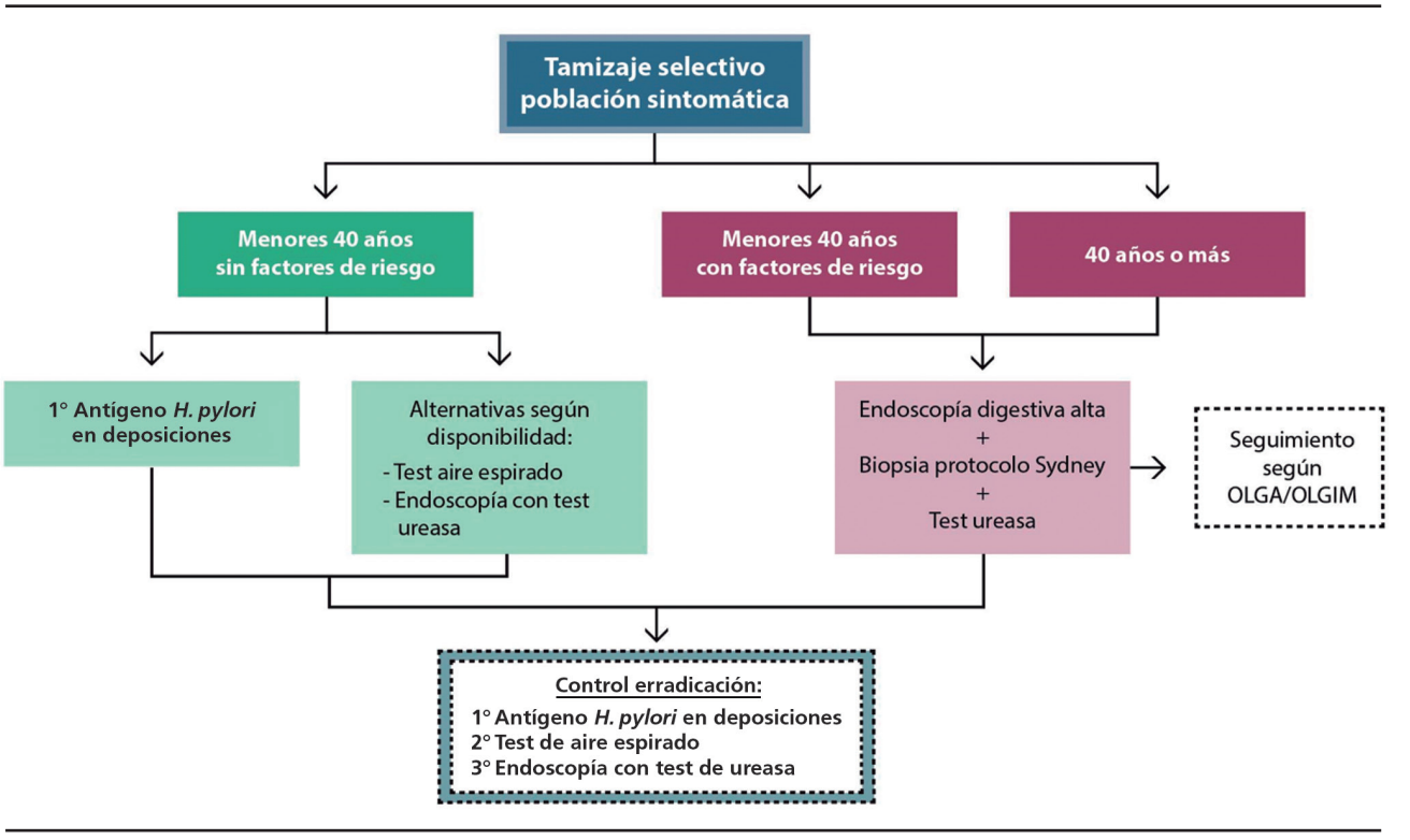 Si el paciente tiene síntomas o signos de alarma como disfagia, baja de peso, anemia, antecedentes familiares de primer grado de cáncer gástrico o es mayor de 40 años, se prefiere el uso de métodos invasivos, a través de la endoscopía digestiva alta con prueba rápida de ureasa y/o tinción en biopsia gástrica. Si tiene familiares con cáncer gástrico de primer grado o tiene hallazgos endoscópicos sugerentes de atrofia o metaplasia intestinal, la toma de biopsias también permite definir el seguimiento endoscópico según OLGA (Operative Link on Gastritis Assessment).71 Es importante que los pacientes que se sometan a estudios diagnósticos suspendan fármacos que pueden llevar a falsos negativos, especialmente los inhibidores de bomba de protones.11