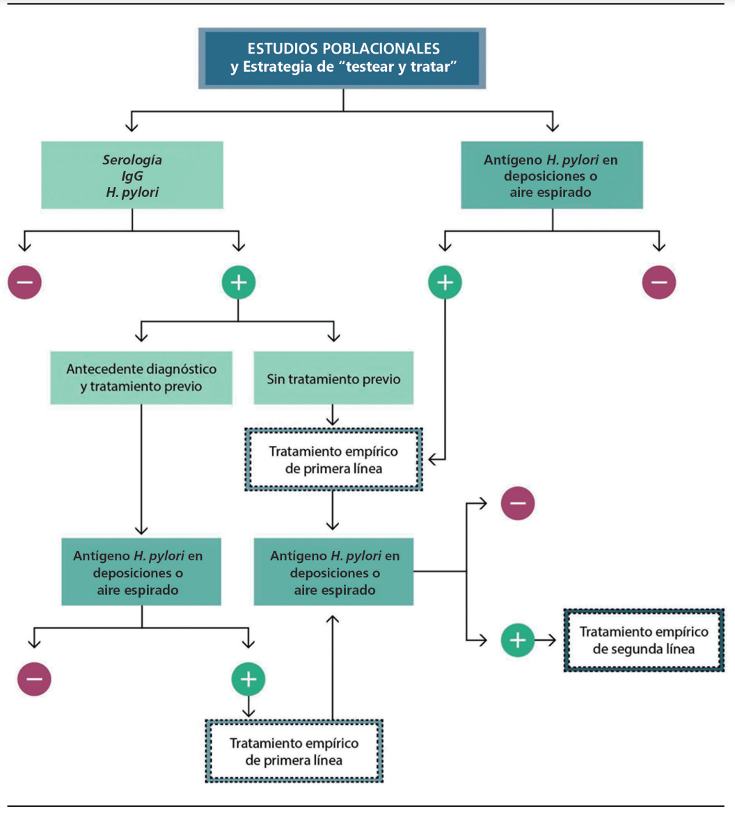 La infección por H. pylori representa un gran impacto en la población ya que se asocia a múltiples patologías, tales como la úlcera péptica, el cáncer gástrico y patologías hematológicas, entre otras. Existe una variada disponibilidad de métodos para pesquisar la infección, ya sean invasivos, que requieren de una endoscopía digestiva alta, como no invasivos. Las pruebas diagnósticas deben elegirse tomando en consideración distintos aspectos, como la edad del paciente, antecedente de infección previa, factores de riesgo de cáncer gástrico, disponibilidad en el medio en que se encuentre el paciente y el costo, entre otros.
