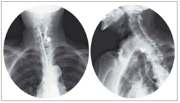 Paciente femenina de 83 años, con antecedentes de cardiopatía isquémica, hipertensión arterial y dependencia funcional, quien ingresó por cuadro agudo de melenas, náusea y anorexia. Al ingreso al servicio de urgencias se encontraba sin signos de choque, con tacto rectal positivo para melena y documentación de anemia sin criterios de transfusión. Se realizó esofagogastroduodenoscopía, que reportó dos desgarros mucosos cardiales, uno de ellos con signos de sangrado reciente, por lo cual se realizó hemostasia con clip, sin complicaciones. Adicionalmente, se halló un divertículo en esófago cervical, inicialmente clasificado como divertículo de Zenker, por lo cual se indicó caracterización por medio de radiografía de vías digestivas altas (Figura 1).