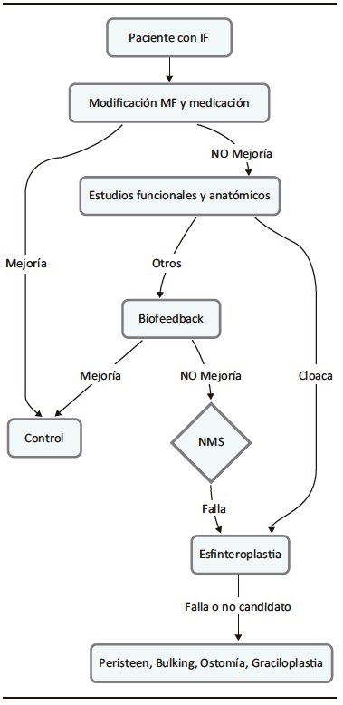 En los casos en los que el tratamiento médico es ineficaz, la estimulación del nervio sacro, agentes de aumento de volumen inyectables o tratamiento quirúrgico son opciones viables.7 Se propone el siguiente algoritmo de tratamiento (Figura 1).