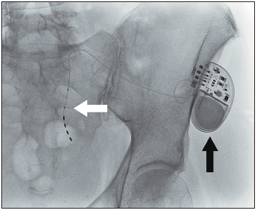sacro. Se observa el electro en forma de “jota” a nivel del foramen de S2 (flecha blanca) y el generador