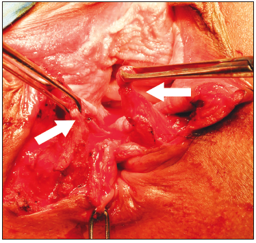 plástica con superposición de los cabos (Overlaping). Las flechas blancas marcan los cabos ya