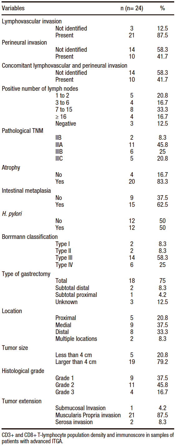A descriptive cross-sectional study was carried out. The study included gastrectomies performed between 2014 and 2016 on patients diagnosed with ITGA who have been classified with TNM stage II or III, and whose blocks of FFPE tissue specimens were in an adequate state of conservation. Patients with the following diagnosis were excluded: diffuse ITGA, I ITGA with TNM stage I or IV, immunosuppression or HIV infection, history of malignant neoplasm or autoimmune disease, history of chemotherapy, radiotherapy, or immunosuppressive treatment, and those whose FFPE blocks were deteriorated.