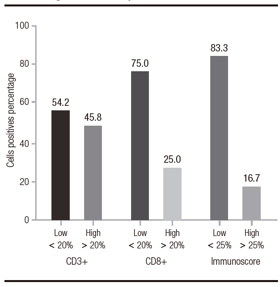 Reactivity for CD3+ and CD8+ was considered positive when immunostaining on the cell membrane occurred. The average percentage of 4 high-powered fields (40x) representative of the tumor process was visually quantified. It was determined as low infiltration an average percentage < 20%, and high infiltration ≥ 20%.17 The immunoscore was calculated averaging the percentage of the CD3+ and CD8+ infiltration, and it was defined as a Low immunoscore: 0-25% and a High immunoscore: ≥ 25% following the standardized values for immunoscore in colon cancer according to the work of Pagès et al. 2018.11