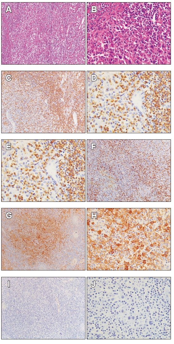 PDL-1 expression on cancer cells. I and J. PD-1 negative on T lymphocytes by IHC. All sections were