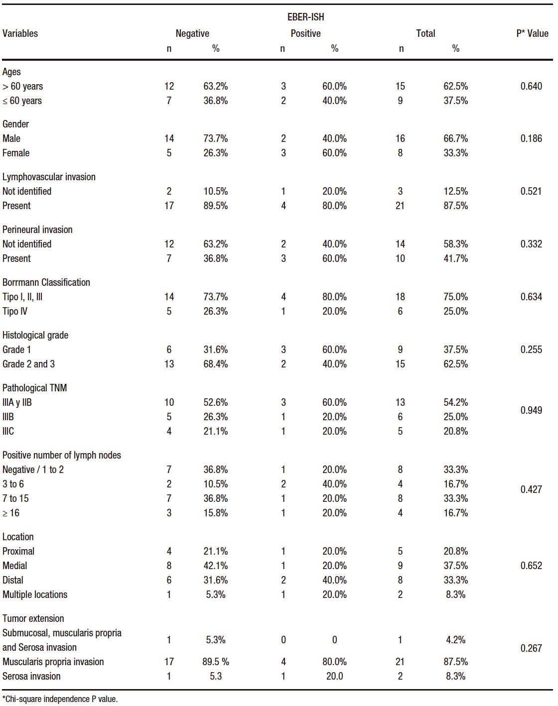 The expression of EBV by EBER-ISH showed that 5 of the patients in the study (20.8%) presented infection by the virus in the cancer cells. The histopathological characteristics are shown in Table 2.