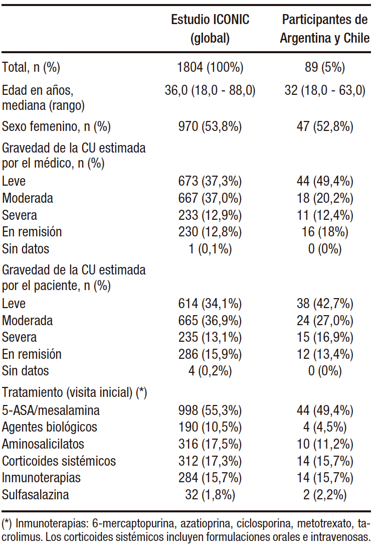 En el estudio ICONIC global, 1804 pacientes evaluables cumplieron con los criterios de inclusión y participaron de al menos una visita de seguimiento. Participaron 89 pacientes de la Argentina y Chile (5% del total global y equivalente a la mitad de los pacientes de América Latina). La mediana del tiempo transcurrido desde el diagnóstico de la CU era de 157 días (rango: 3 a 1078 días). Otros datos demográficos y clínicos de interés se resumen en la Tabla 2.