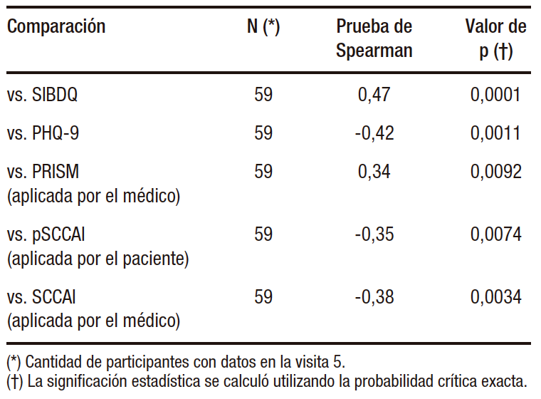 En concordancia con lo informado para el estudio principal, el sufrimiento de los pacientes atribuido a la CU cuantificado por la herramienta PRISM se redujo significativamente en los pacientes argentinos y chilenos del estudio ICONIC. Esta disminución del sufrimiento se observó tanto con la aplicación de la herramienta por parte de los pacientes (SIS inicial: 3,6 ± 2,5 contra SIS a los 24 meses: 4,7 ± 2,6; p < 0,05) como de los médicos y se correlacionó con los otros criterios de valoración (SIBDQ, PHQ-9, SCCAI) (Tabla 3).