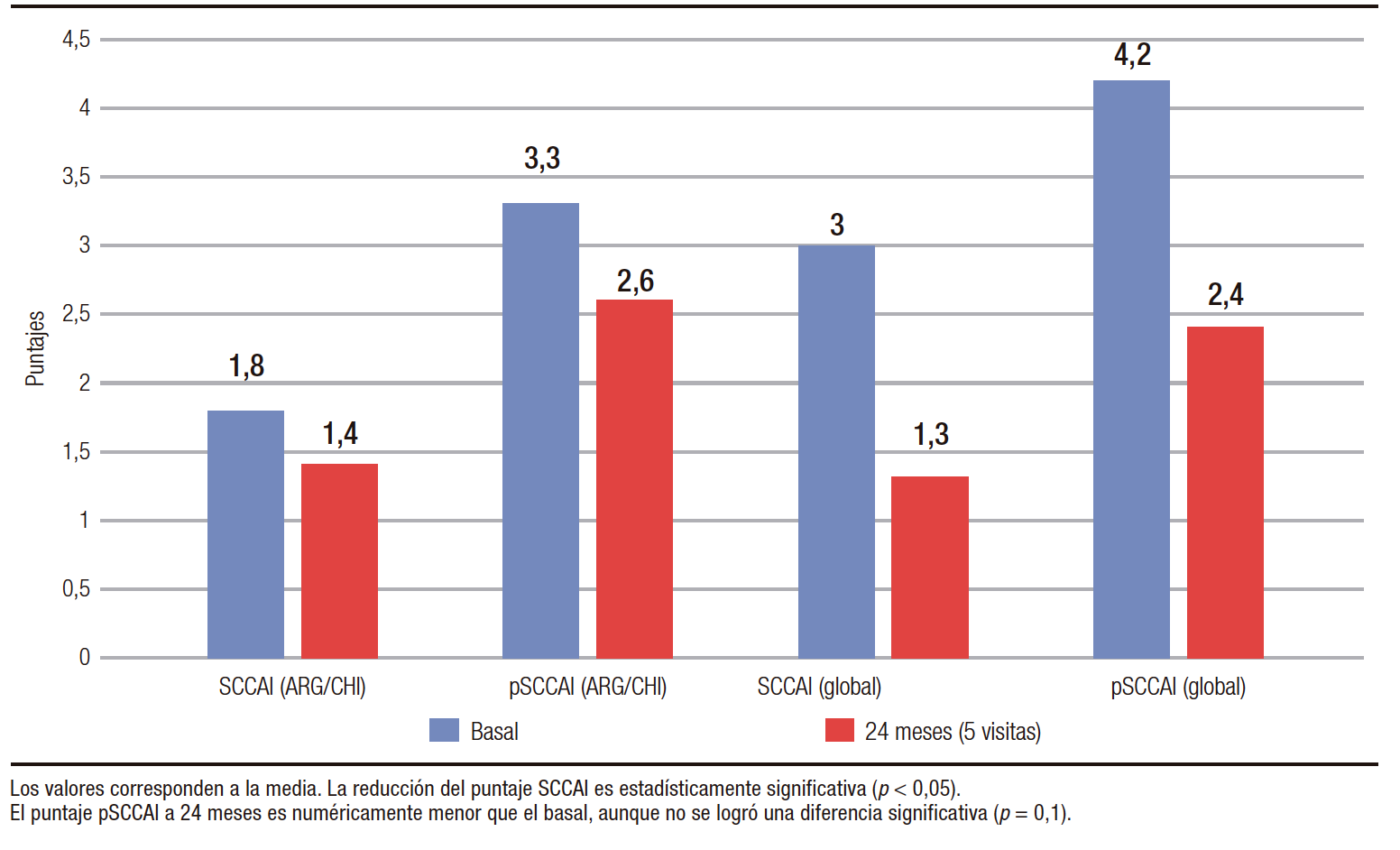 A lo largo del seguimiento de 24 meses (equivalente a cinco visitas programadas), la severidad de la CU cuantificada mediante las escalas SCCAI (médico) y pSCCAI (paciente) se redujo en los participantes de la Argentina y Chile del estudio ICONIC. Esta disminución fue relativamente menor a la descripta para la cohorte global (Figura 2).