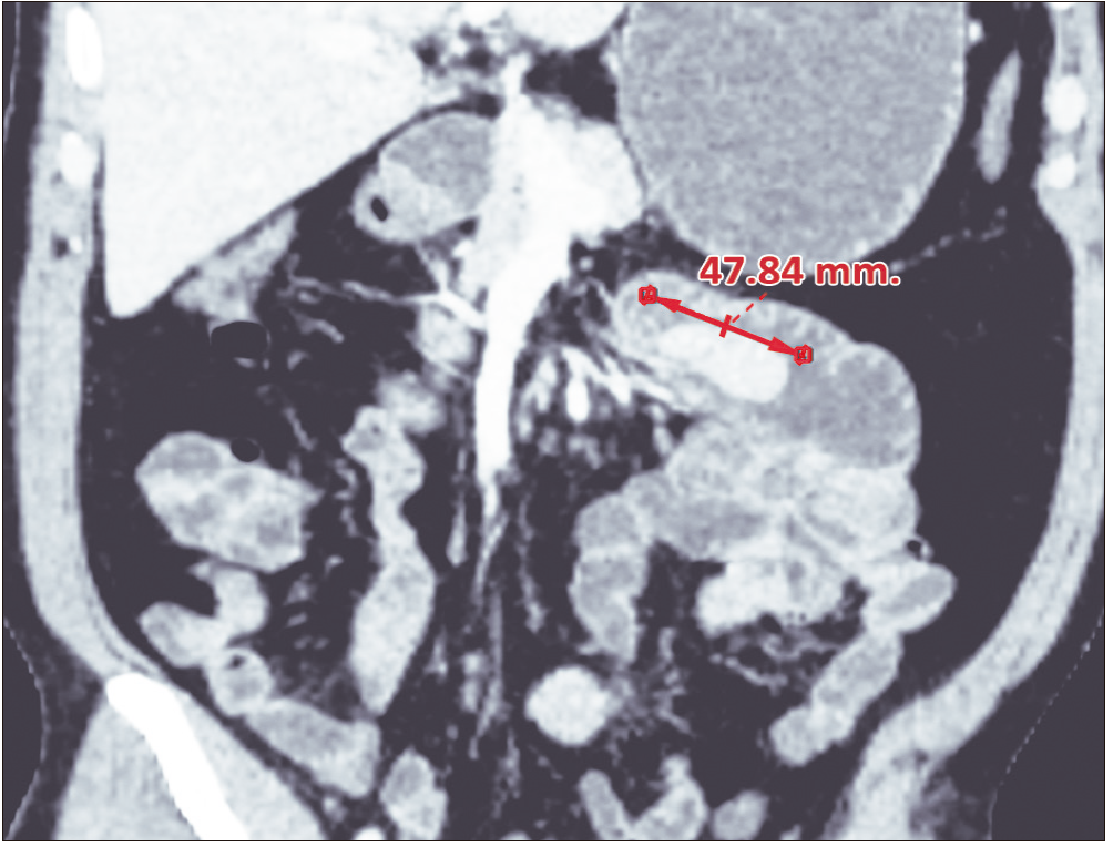 Se solicitó una enterotomografía que mostró una imagen protruida, con pedículo ancho de aspecto heterogéneo, de 47 mm aproximadamente, a nivel de la tercera y cuarta porción duodenal, con marcado realce tras la administración de contraste endovenoso. (Figura 3).