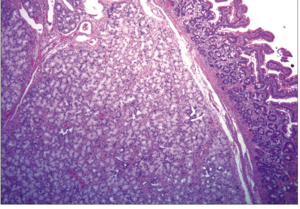 Si bien la patogénesis para el desarrollo de la hiperplasia de las glándulas de Brunner es incierta, en la literatura se han descripto asociaciones con la hiperclorhidria, en pacientes que presentan gastritis crónica erosiva y úlceras duodenales.4-5