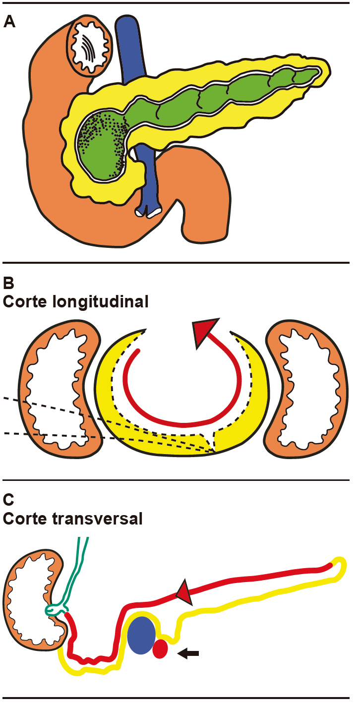 (cavidad ojival). B: Corte transversal a nivel de la cabeza del páncreas (línea roja)