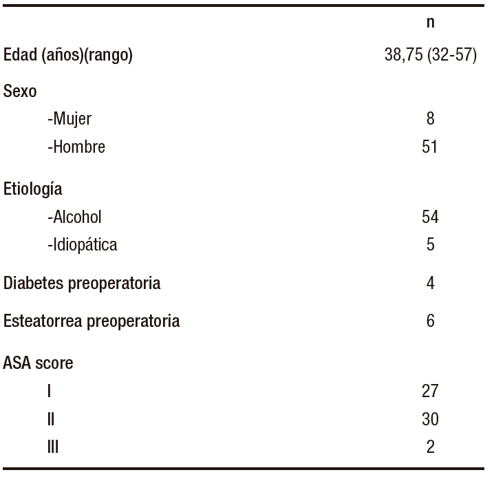 La OF fue realizada en 8 mujeres y en 51 hombres. La edad promedio fue de 38,75 años, con extremos de 32 y 57 años. En 54 pacientes la etiología fue alcohólica y en los 5 restantes fue idiopática. De los 59 pacientes, 4 eran diabéticos y 8 tenían esteatorrea.