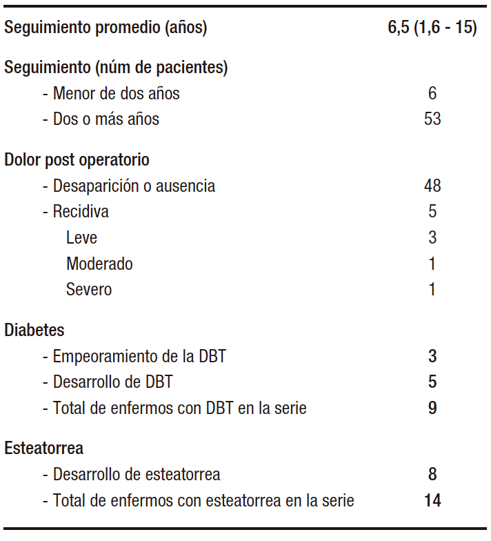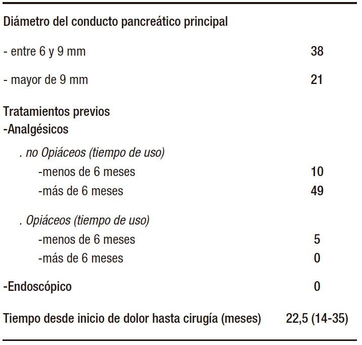 La totalidad de los enfermos recibió tratamiento inicial con analgésicos no opioides. 10 pacientes lo recibieron durante un período menor de 6 meses y los 49 restantes durante más de 6 meses. Cinco pacientes requirieron opioides por un lapso menor a 6 meses, por falta de respuesta al tratamiento con analgésicos comunes. Ningún paciente de la serie recibió tratamiento endoscópico. La totalidad de los enfermos fue operada dentro de los tres años (36 meses) desde el inicio del dolor, siendo el promedio de la serie de 22,5 meses, con extremos de 14 y 35 meses (Tabla 2).