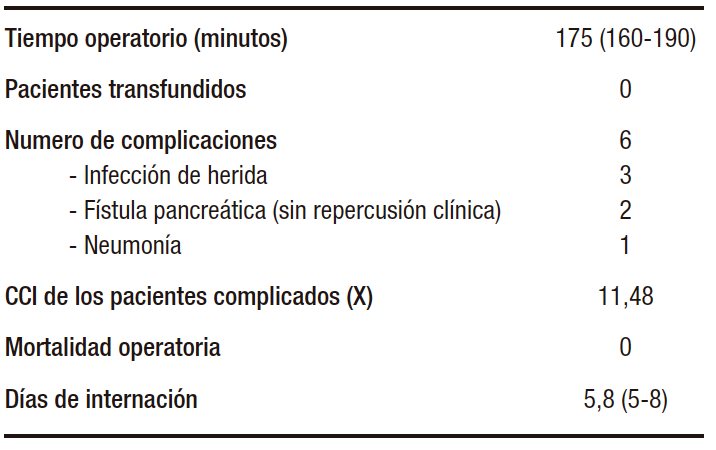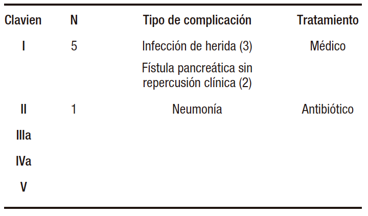 De los 59 enfermos operados, 5 pacientes presentaron complicaciones (8,4%) y uno de ellos desarrolló dos complicaciones. La totalidad de las complicaciones correspondieron a los grados I y II de la clasificación de Dindo-Clavien. El CCI promedio de las complicaciones fue de 11,48 (Tabla 3 y Tabla 4).