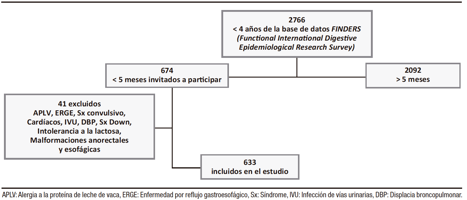 De los 2766 niños latinoamericanos menores de 4 años (Sudamérica: Colombia y Ecuador, y Centroamérica: Panamá, Cuba, El Salvador, Nicaragua y México) registrados en la base de datos de Functional International Digestive Epidemiological Research Survey (FINDERS) entre el 15 de junio de 2018 y el 15 de febrero de 2022, fueron incluidos 674 lactantes menores de 5 meses de edad. El 6,1% se excluyeron (n= 41) por alergia a la proteína de leche de vaca, enfermedad por reflujo gastroesofágico, intolerancia a la lactosa, síndrome de Down, malformaciones anorrectales y esofágicas, y enfermedades neurológicas, cardíacas, renales y respiratorias; quedando para el análisis final 633 lactantes (Figura 1).
