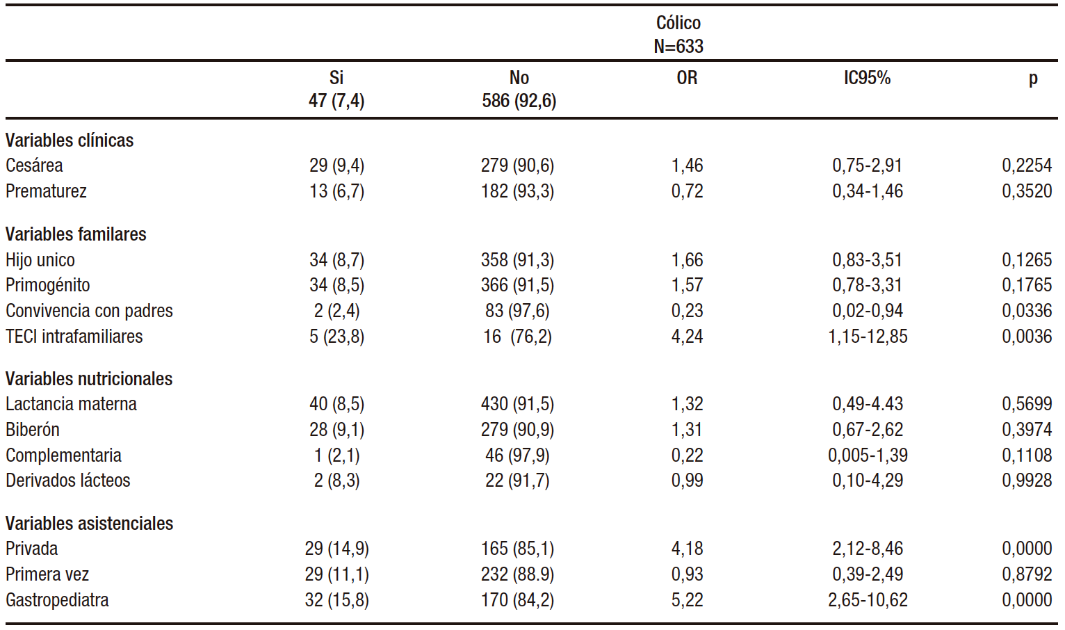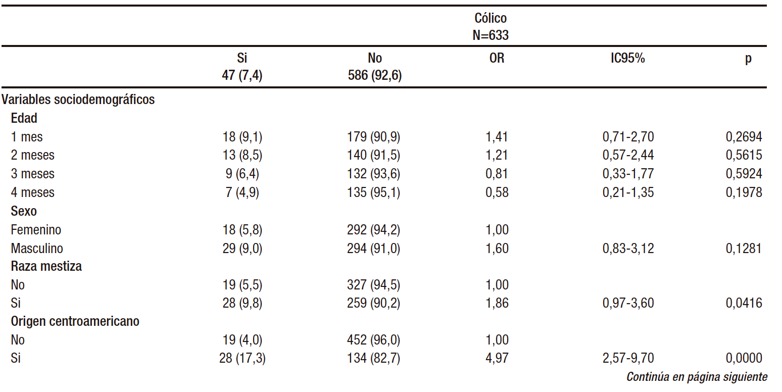 Tabla 2. Posibles asociaciones entre cólico y variables en lactantes latinoamericanos