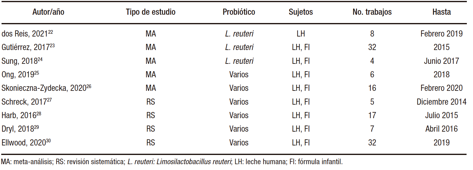 Tabla 3. Meta-análisis y revisiones sistemáticas sobre el uso de probióticos en