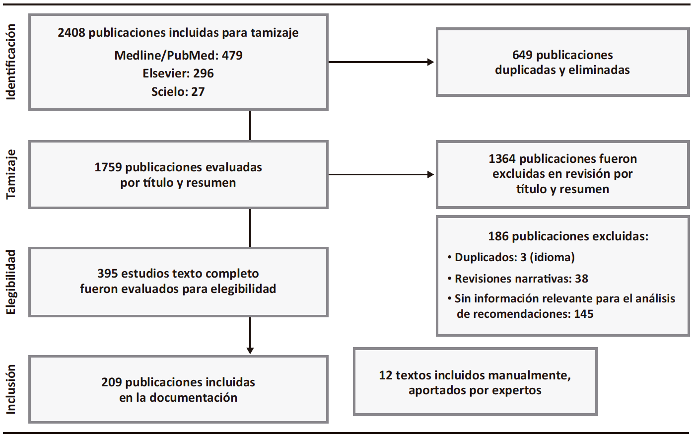 Posteriormente, a solicitud de los expertos, se amplió la búsqueda hasta diciembre 2021 y se revisó también la base de datos Scielo en búsqueda de textos específicos de la región. A solicitud de revisores externos se agregaron manualmente referencias de 2022 aportadas por expertos y revisores para aportar más datos de la región (Figura 1).