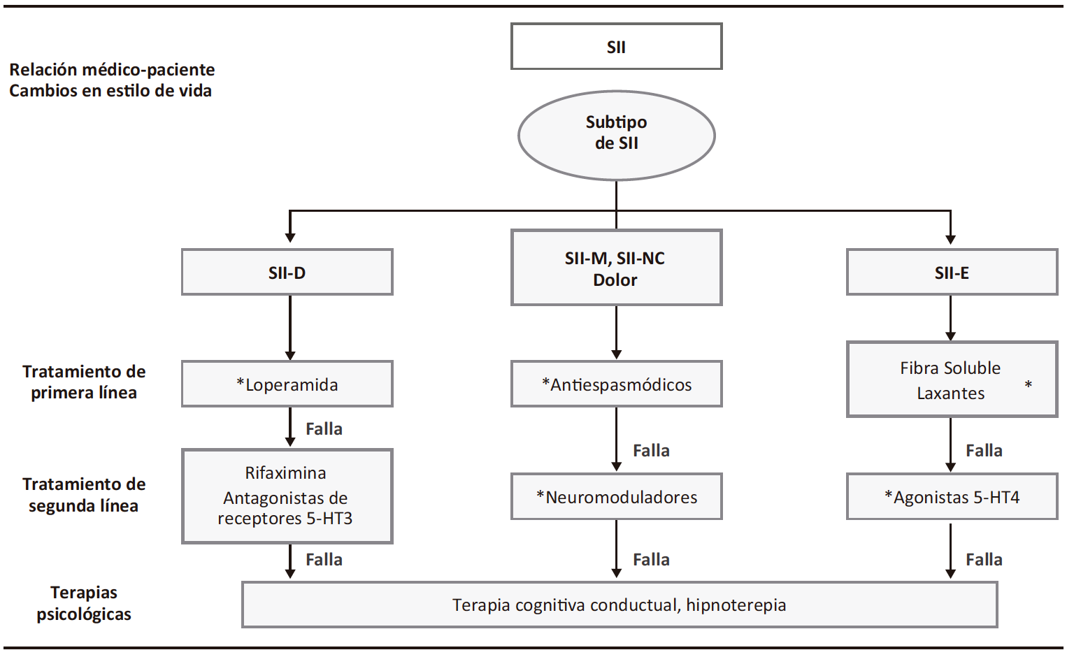 El tratamiento del SII es multifactorial y en general los pacientes requieren más de una intervención terapéutica. El manejo puede incluir un estilo de vida saludable, medidas higiénico-dietéticas, terapia farmacológica, apoyo psicológico y el uso de medidas alternativas, según sea el criterio del clínico.