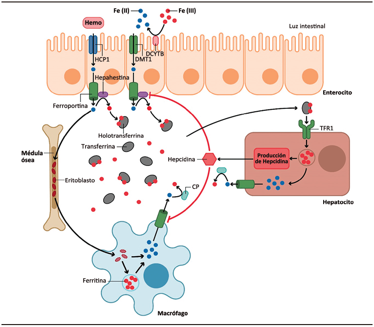 La absorción de hierro es el resultado de un mecanismo complejo que ocurre en el duodeno y el yeyuno proximal. Inicialmente, en el estómago, el hierro hémico es disociado de las hemoproteínas (hemoglobina y mioglobina) y el no hémico es reducido a ferroso (Fe2+).3 En los enterocitos duodenales, el transportador de metales divalentes 1 (DMT1) es el responsable más importante de la absorción del Fe2+. A su vez, el hierro hémico es absorbido en el duodeno por la proteína transportadora hemo 1 (HCP1). Una vez que el hierro ingresa a los enterocitos, su destino dependerá de las concentraciones intracelulares.2