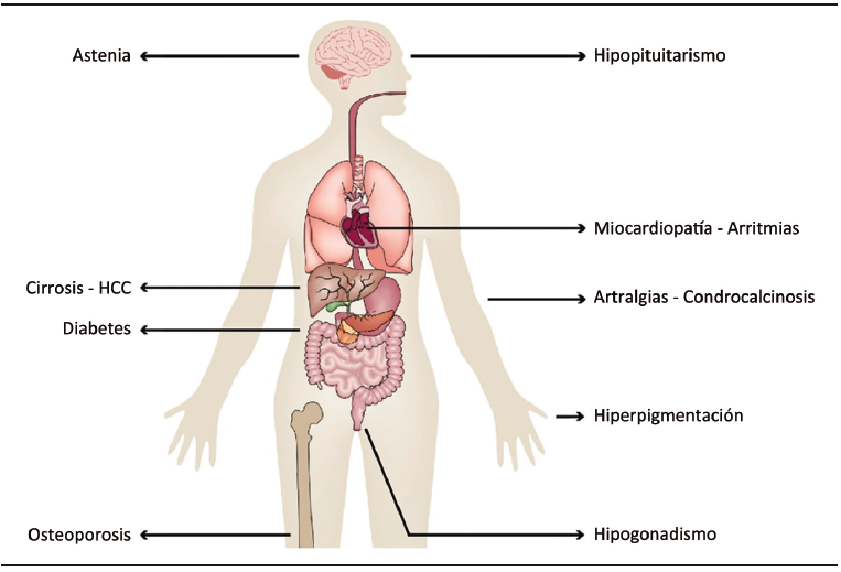 Los portadores de HH pueden ser asintomáticos o sintomáticos. (Figura 3). Las manifestaciones clínicas aumentan con la edad, en forma paralela al incremento de los depósitos de hierro y a los órganos afectados.