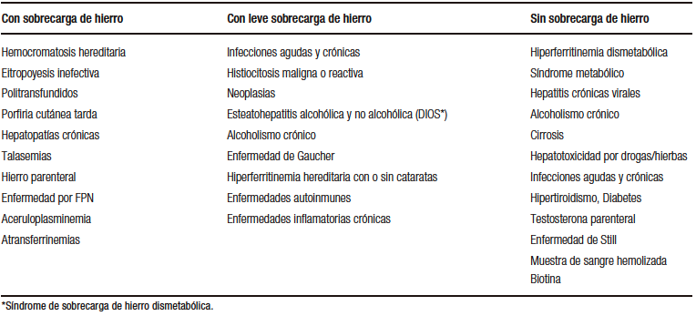 70% de los pacientes con hiperferritinemia no tienen sobrecarga de hierro (Tabla 2).