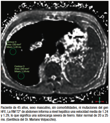 En los pacientes con FS y STf elevadas con o sin homocigosis C282Y, el estudio que se debería hacer a continuación es la RM T2*, procedimiento no invasivo de alta reproducibilidad, aunque costoso, que tiene una elevada sensibilidad y especificidad para detectar y ponderar el hierro hepático y en otros órganos (bazo, páncreas, corazón y cerebro) (Figura 4).39-40 Un aspecto controversial es la detección de sobrecarga de hierro esplénica en forma paralela a la hepática en pacientes con diagnóstico presuntivo de HH. Algunas publicaciones sugieren que solo se puede detectar en las hemocromatosis secundarias. Sin embargo, otras publicaciones no coinciden con este concepto. En nuestra experiencia, en 113 pacientes con diagnóstico bioquímico e histológico de HH a los que se les realizó RM T2*, con o sin mutaciones del gen HFE y sin otras causas que justifiquen el exceso de hierro, detectamos sobrecarga férrica esplénica en un 47% de los casos, siendo estadísticamente más frecuente en aquellos con FS > 1000 ng/ml, hepatomegalia y manifestaciones articulares. Por lo tanto, en nuestra opinión, creemos que el hallazgo conjunto de exceso de hierro hepático y esplénico no invalida el diagnóstico de HH, pero en estos casos es necesario recurrir a la biopsia hepática para confirmar el diagnóstico de HH, aún en aquellos pacientes con mutaciones HFE.41