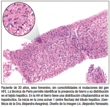 El tejido hepático obtenido por biopsia se analiza con las tinciones habituales y con la tinción de Perls para evaluar la presencia de hierro y su distribución. En la HH se observa el patrón parenquimatoso (citoplasma de los hepatocitos) con ausencia o presencia de un leve infiltrado inflamatorio y diferentes estadios de fibrosis. En la eritropoyesis ineficaz en no transfundidos la distribución del hierro hepático es similar al de la HH, por lo que este diagnóstico debe ser investigado durante la evaluación del paciente con sobrecarga de hierro (Figura 5). La cuantificación del hierro en el tejido puede hacerse en forma semicuantitativa en una escala de 1 a 4, midiendo la concentración de hierro hepático por espectrofotometría de absorción atómica en tejido fresco y parafinado, o mediante el índice de hierro.5-7, 42