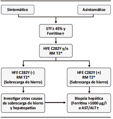 Cuando la FS y la STf se encuentran en niveles elevados, se debe continuar el estudio con la búsqueda de las mutaciones C282Y y H63D del gen HFE. Algunas publicaciones sugieren que solamente se debe investigar la mutación C282Y. Sin embargo, las Guías de práctica clínica sobre hemocromatosis de la EASL mencionan que: la identificación de la variante genética específica causante de la enfermedad no es necesaria ni suficiente para el diagnóstico en pacientes con hemocromatosis de inicio en la edad adulta, ya que dicho diagnóstico se basa en criterios fenotípicos.6