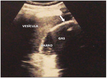enfisema parietal de dicho órgano, asociado a nivel hidroaéreo. Podría tratarse de un cuadro de CE