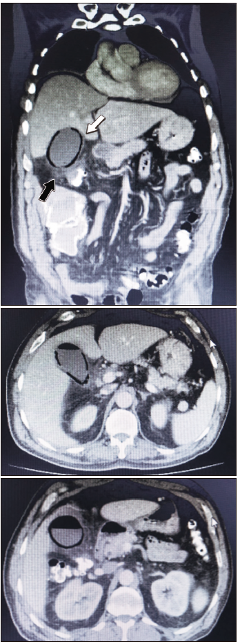 Hombre de 55 años, sin antecedentes de clínicos de relevancia, que ingresó con dolor abdominal con tres días de evolución localizado en hipocondrio derecho. Al momento del ingreso el paciente se presentaba estable, con dolor en la palpación en la parte superior del abdomen y sin irritación peritoneal. En el hemograma se detectó leucocitosis con neutrofilia; los análisis no mostraron otras alteraciones. Presentó una radiografía simple de abdomen dentro de parámetros normales. Se realizó una ecografía abdominal que mostró vesícula distendida, de paredes regulares y de 3,8mm; en bacinete presentó cálculo de 13mm, barro biliar y microlitiasis. Dentro de la vesícula se observó una banda de gas compatible con CE; vía biliar no dilatada. (Figura 1) Se complementó con una TC de abdomen y se confirmó el diagnóstico de CE sin neumoperitoneo. (Figura 2)