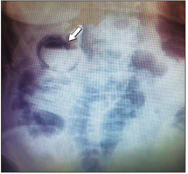Figura 3. Radiografía directa de abdomen. Se observa imagen radiolúcida (flecha