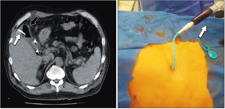 izquierda: se observa catéter en el interior de la vesícula biliar (flecha blanca). Presencia de aire en la