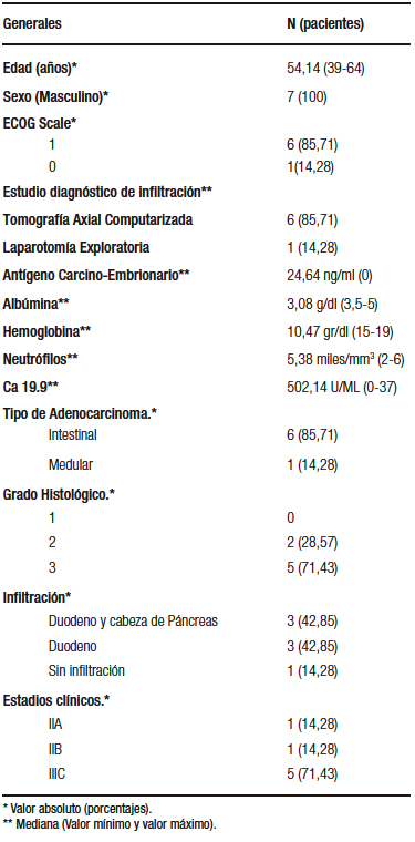 La sospecha diagnóstica de infiltración tumoral a órganos adyacentes se determinó mediante una tomografía axial computarizada (TAC) de abdomen en 6 de los pacientes. En uno de los pacientes la infiltración a órganos adyacenes no se tenía previamente documentada en la tomografía y se evidenció durante una laparoscopía diagnóstica. Se encontró una mediana de albúmina de 2,90 g/dl, de antígeno carcinoembrionario de 5,40 ng/ml, de hemoglobina de 10,30 gr/dl y de Ca 19,9 de 94,70 u/ml.