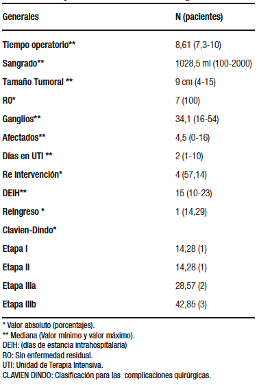 Dentro de los hallazgos quirúrgicos, se reportó una mediana de tiempo operatorio de 9 horas y una mediana de sangrado de 800 ml. Ningún paciente requirió colostomía. En el reporte histopatológico, el 100% de los pacientes presentaron bordes negativos. La mediana del tamaño tumoral fue de 7 cm (RIC: 5-8). El 71,42% de los pacientes presentó ganglios positivos para malignidad, con una mediana de 24 (RIC: 23-52) ganglios resecados. Posterior al procedimiento quirúrgico, 4 pacientes requirieron manejo por la Unidad de terapia intensiva (UTI) con una estancia media de 2 días. La media total de estancia intrahospitalaria fue de 15 días. El 85,71% de los pacientes presentó complicaciones posquirúrgicas, para las cuales se utilizó la clasificación Clavien-Dindo (Tabla 2). El 14,28% clasificó en etapas I y II; el 28,57% en etapa IIIa y el 42,85% en etapa IIIb. La complicación más frecuente fue choque hipovolémico en el 71,4% (n= 5) de los pacientes. El 42,8% (n= 3) requirió reintervención quirúrgica en menos de 30 días.