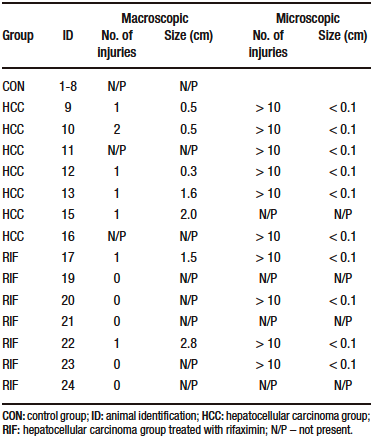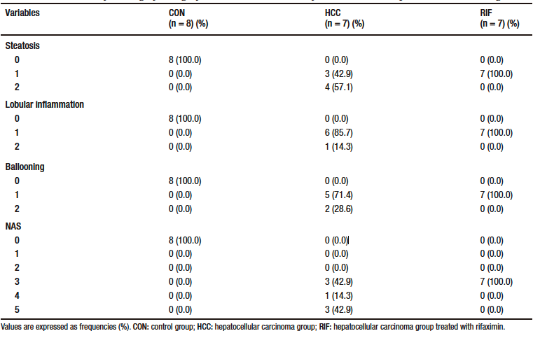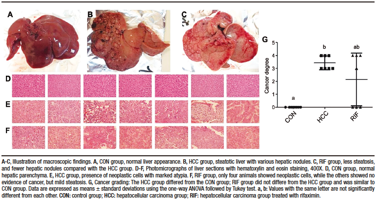 Macroscopically, all animals in the HCC group developed liver tumors that were larger than those in the RIF group. As expected, the control animals had normal livers (Figure 1A-C). Histologic analyses showed that all animals in the HCC group had an altered parenchyma, while treatment with rifaximin appeared to reduce the degree of the lesion. No evidence of hepatic tumor injury was observed in the CON group (Figure 1D-F). Liver lesions are described macroscopically and microscopically in Table 2. When tumors were graded according to the Edmondson-Steiner score (Figure 1G), we observed that all animals in the HCC group had grades three and four, corresponding to poorly differentiated and undifferentiated cancer, respectively. In the RIF group, some animals were also classified as grades three and four, but three animals had no evidence of cancer (Supplementary Table 5).