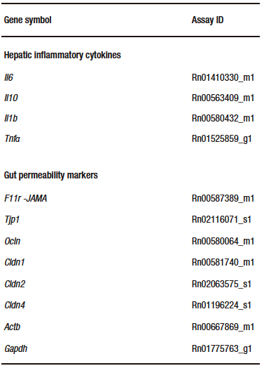 After euthanasia, the liver and small intestine were collected and total RNA was extracted with TRIzol (Invitrogen, United States); RNA was later converted to cDNA using the High-Capacity cDNA Reverse Transcription kit (Applied Biosystems, United States). qRT-PCR with TaqMan assay (Applied Biosystems, USA) was used to assess the gene expression of hepatic inflammatory cytokines: interleukin (Il)-6, Il10, Il1b, and tumor necrosis factor-α (Tnfa) and intestinal tight junction proteins: occludin (Ocln), claudin (Cldn)-2, Cldn4, zona occludens (Zo1) and junctional adhesion molecule (JAM/F11r). The Actb and Gapdh genes were used as normalisers (Supplementary Table-1). Values were calculated as a percentage of the normalising gene.