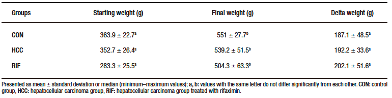 At 15th week, one animal died in each of the HCC and RIF groups. These animals were excluded from the study. No deaths were reported in the CON group during the experimental period. There was no statistically significant difference in the animals’ delta weight (Supplementary Table-2).