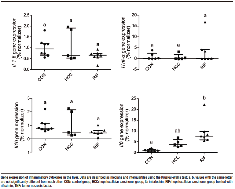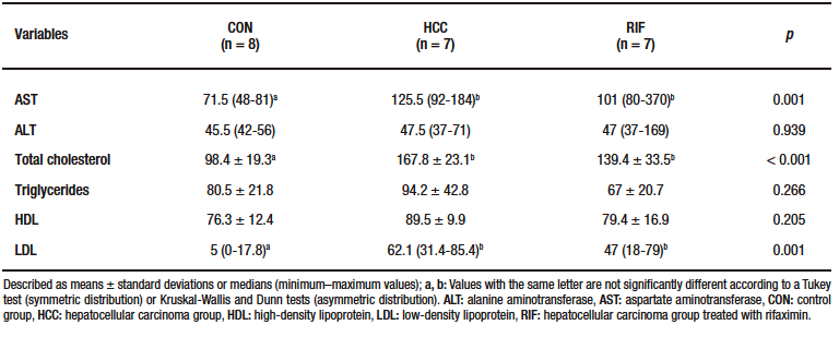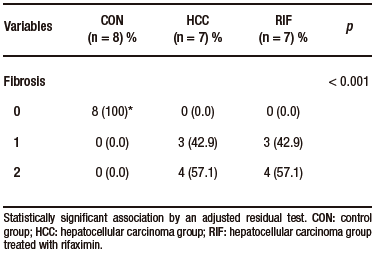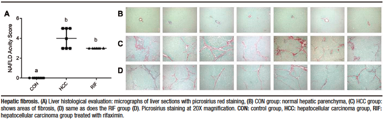 None of the control animals showed features of liver injury, as shown in Table-1. With regard to steatosis, animals in the HCC group had a significantly higher fat content than those in the RIF group. The same happened with hepatocyte ballooning. The HCC group had a NAS between three and five; these scores indicate probable and definitive steatohepatitis, respectively. However, all rifaximin-treated animals remained in grade 3, indicating a probable diagnosis of steatohepatitis, suggesting a moderate efficacy of rifaximin treatment (Table 1). When assessing fibrosis by picrosirius red staining, we observed that both the HCC and RIF groups had areas of fibrosis that were different from the CON group (Supplementary Figure 3). In both the HCC and RIF groups, animals ranged equally from grades 1 to 2. As expected, the CON group was grade 0 (Supplementary Table 4).